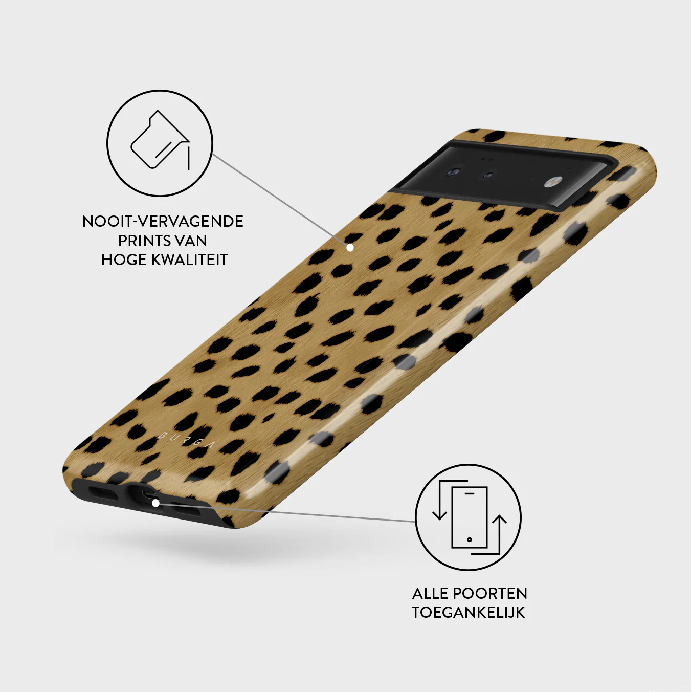 - Verhoogde randen rond de camera voor extra bescherming.