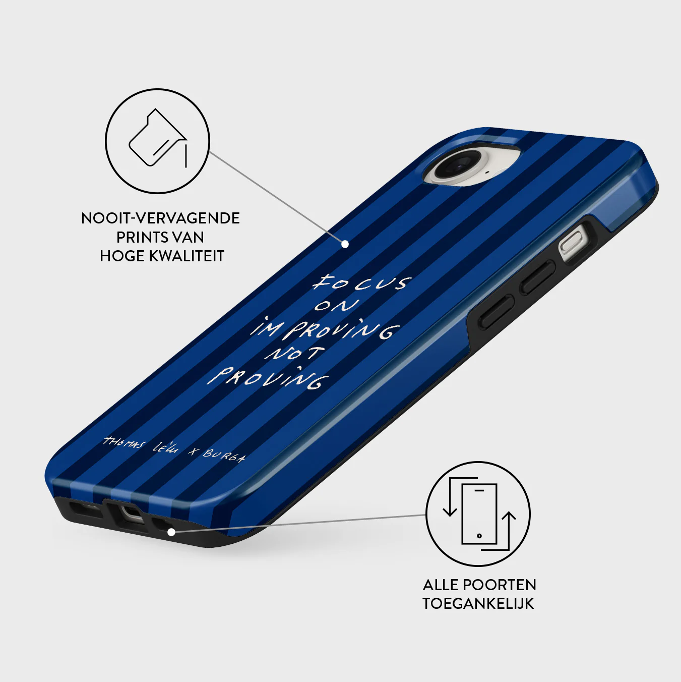 Kenmerken van dit design: handgeschreven tekst, citaat, blauwe strepen