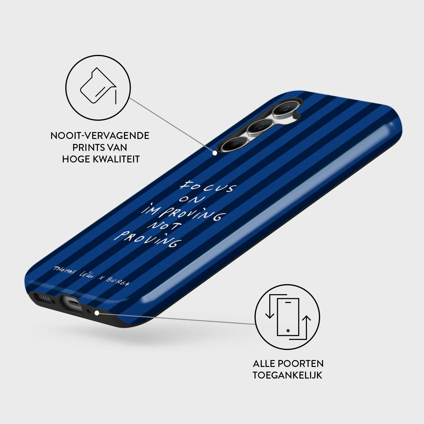 Kenmerken van dit design: handgeschreven tekst, citaat, blauwe strepen