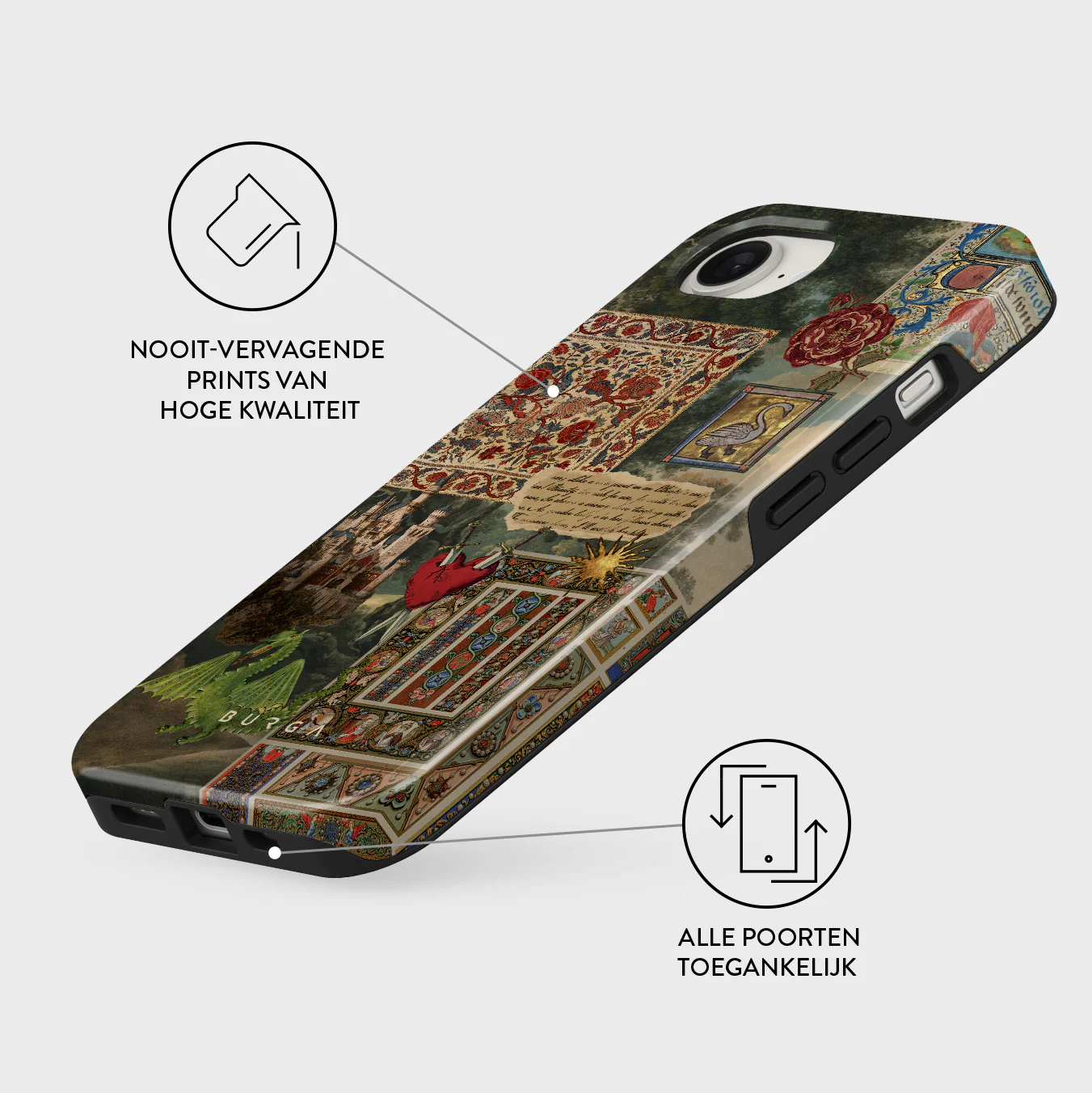 Kenmerken van dit design: handgeschreven kalligrafisch lettertype, vintage print, middeleeuws design, bloemenpatroon, oude boekillustraties, hart, draak, kasteel
